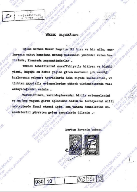 “Oğlum merhum Enver Paşa’nın iki kızı ve bir oğlu, analarının sakıt hanedana mensup bulunması sebebiyle Fransa’da yaşamaktadır. Yüksek tahsillerini muvaffakiyetle bitiren ve büyüğü yirmi, küçüğü on dokuz yaşına gelen kızlarının yabancı diyarlarda daha fazla kalmalarına ve Türk olmayan biriyle evlenmelerine yüksek vicdanınızın razı olmayacağı kanaatindeyim. Torunlarımın karındaşlarından biriyle evlenmelerini ve on beş yaşına giren oğlanın da talim ve terbiyesini millî mekteplerde tamamlayabilmesi için anavatana dönmelerine izin verilmesini saygıyla dilerim.”