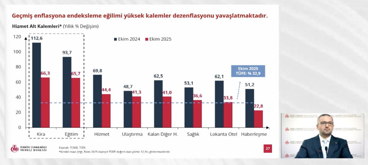 Para politikasında sıkı duruşumuzla ana eğilimdeki düşüşün devamını sağlamakta kararlıyız. Eğitim ve kira gibi zamana bağlı fiyat belirleme ve geçmiş enflasyona endeksleme eğilimi yüksek kalemlerin etkisiyle hizmet enflasyonundaki ataletin dirençli seyrini koruduğunu görüyoruz. Tahmin aralığımıza buradan bir etki geldiğini söylemeliyiz. Kira enflasyonu öngörülenden dirençli seyretmekle birlikte son aylarda yavaşladı.