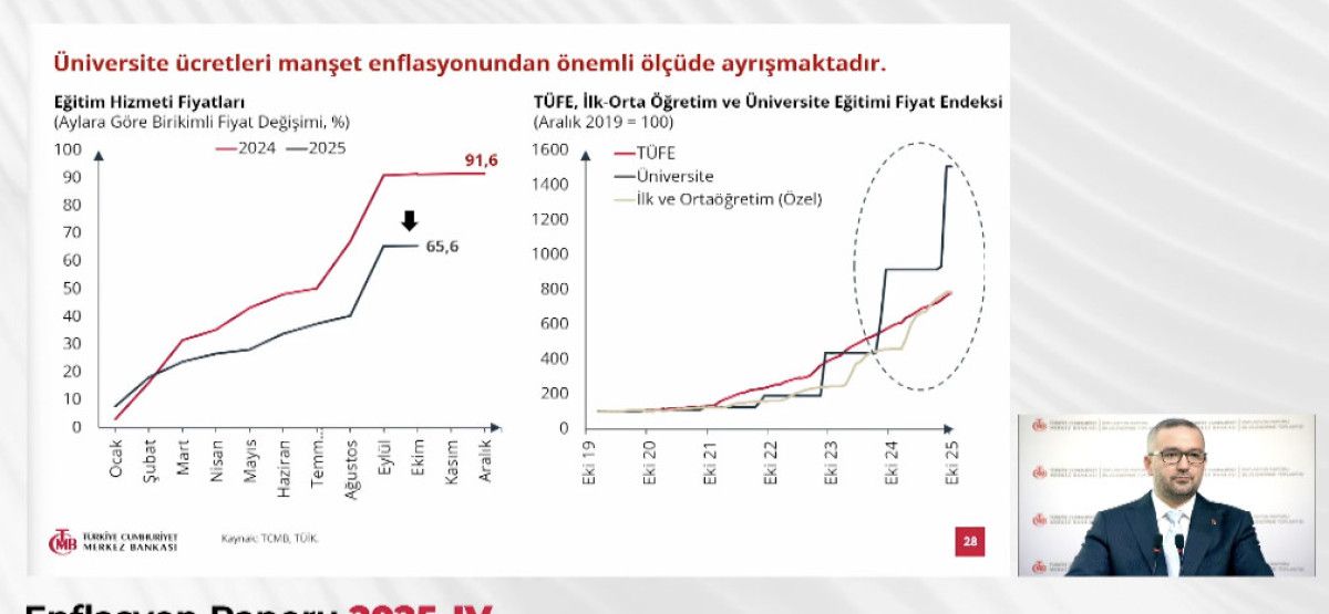 Karahan, enflasyon tahminlerini; bir önceki raporda 2025 yıl sonu için yüzde 24, 2026 yılı sonu için yüzde 12, 2027 yılı sonu için yüzde 8 ve orta vadede yüzde 5 olarak açıklamıştı.