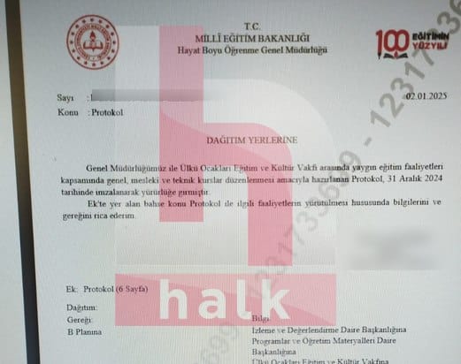 “Genel Müdürlüğümüz ile Ülkü Ocakları Eğitim ve Kültür Vakfı arasında yaygın eğitim faaliyetleri kapsamında genel, mesleki ve teknik kurslar düzenlenmesi amacıyla hazırlanan protokol, 31 Aralık 2024 tarihinde imzalanarak yürürlüğe girmiştir. Ek’te yer alan bahse konu protokol ile ilgili faaliyetlerin yürütülmesi hususunda bilgilerimi ve gereğini rica ederim.”